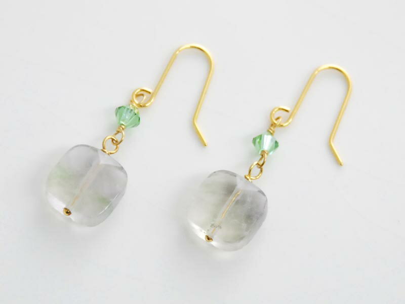 ほぼカラーレスに近いグレイッシュなグリーンのフローライトを、スワロフスキービーズと連ねたピアスです。